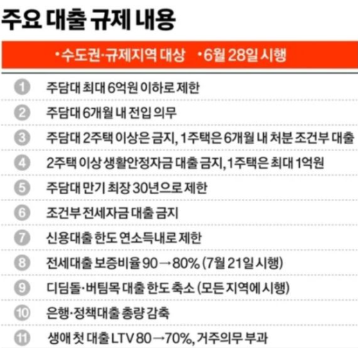 - 이번 조치로 새로 조정대상지역 및 투기과열지구로 지정된 지역은 대출, 세제, 전매, 청약, 정비사업 등 부동산 전반의 규제가 대폭 강화된다. 주택담보대출의 경우 담보 인정 비율(LTV)이 무주택자 40%, 유주택자 0%로 조정된다. 전세대출 한도는 1주택자 2억원으로 제한되며 조건부 전세대출도 막힌다. 신용대출 역시 1억원을 초과한 보유차주는 1년간 규제지역 내 주택 구입이 제한된다.